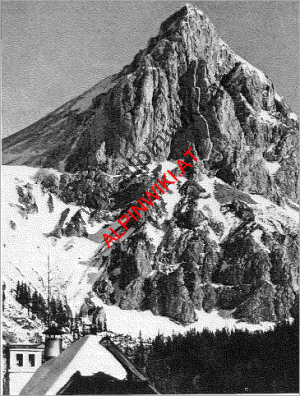 Neuer Weg durch die Westwand Der Admonter Kalbling entsendet nach Südwesten einen ausgeprägten Felssporn, der den Südgrat trägt. Auf seiner Westseite bricht dieser Sporn in einer steilen Plattenwand ab, die mit einem gewaltigen Überhang im Kar ansetzt. Dieser Überhang wird links umgangen, dann beginnt eine vorwiegend hakentechnische Seillänge (A1). Von nun an hat man abwechslungsreiche freie Kletterei in herrlich festem Fels vor sich. Die Route folgt einer Reihe von Rissen, wendet sich dann nach links in einen Kamin, verläßt ihn nach 11/2 Seillängen wieder nach links und führt auf den Gipfel des Spornes. Dort erreicht man den Südgratweg von Horeschowsky und Piekielko